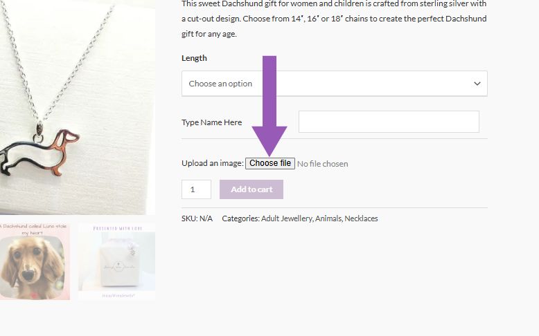 I can create a personalised box with your own dog on as pictured. You simply need to click here as shown by the arrow to upload from your device. You can also add the name of your dog to the order if required (As pictured with my own Dachshund, Little Legs Luna!)